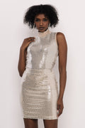 Az AMNESIA Manni felső a csillogás és a modern stílus tökéletes ötvözete. Flitteres, szűk fazonja kiemeli az alakot, miközben a rövid garbó és az ujjatlan kialakítás elegáns és trendi megjelenést biztosít. Fekete és ezüst színekben elérhető, így ideális választás különleges alkalmakra vagy parti outfitekhez. Egy figyelemfelkeltő darab, amely garantáltan ragyogást visz a megjelenésedbe! Viseld a hozzá tervezett AMNESIA Venda szoknyával!