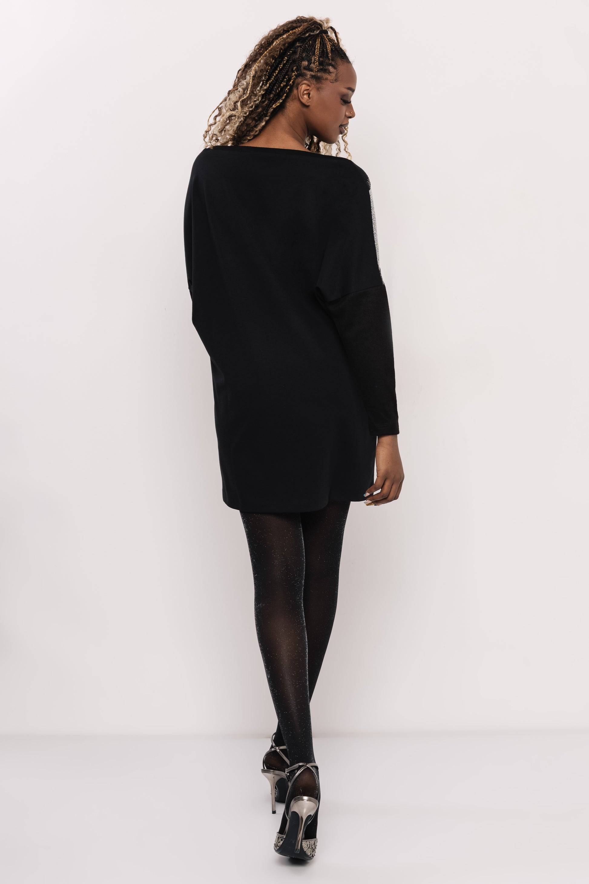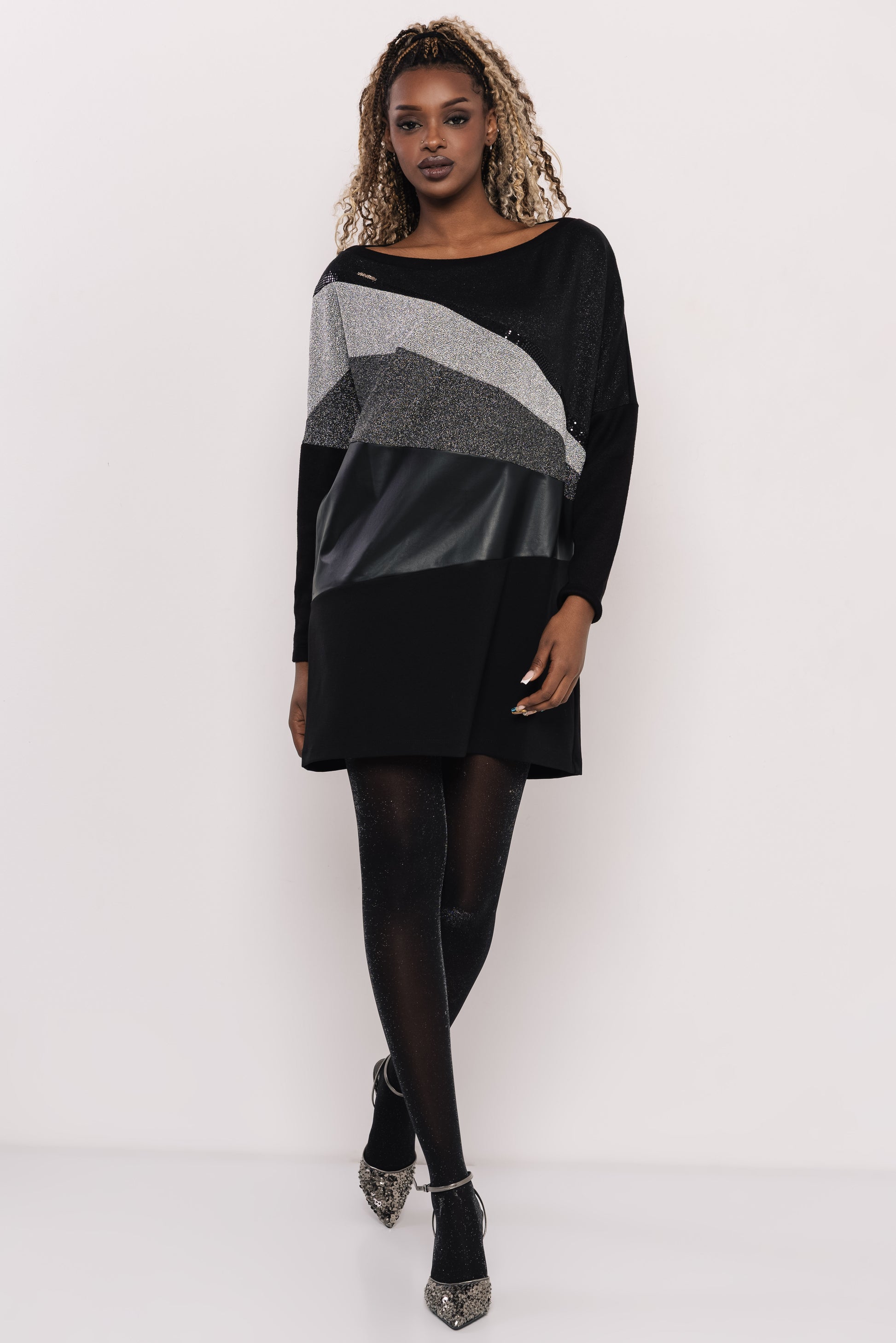 Az AMNESIA Milar ruha finom kötött anyagból készült, amelyet flitteres, lurexes és bőr betétek tesznek igazán különlegessé. Nőies, lezser fazonja minden testalkaton előnyösen mutat, miközben egyedi és stílusos megjelenést biztosít. Ideális választás, ha kényelmes, mégis figyelemfelkeltő darabra vágysz!