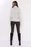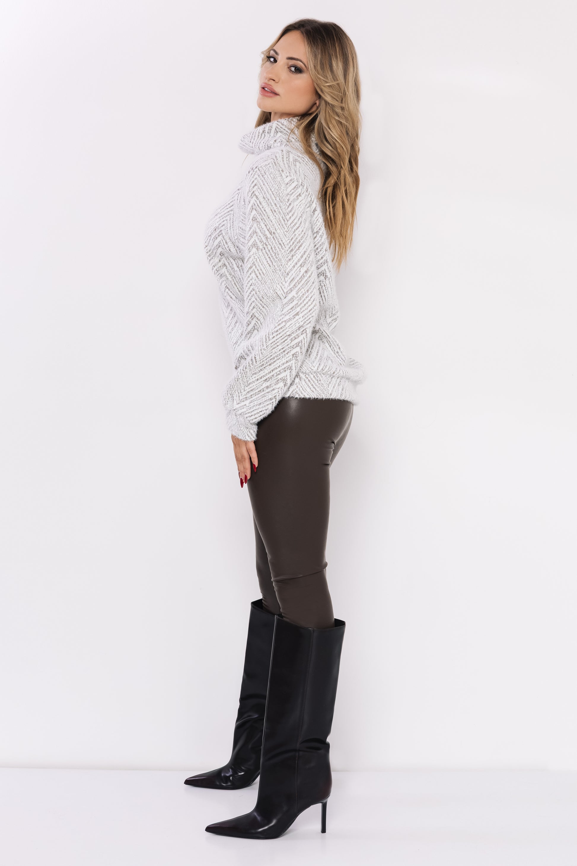 Az AMNESIA Nefer pulcsi a szezon egyik legkedveltebb darabja – puha, szőrös jacquard anyagból készült, amely kellemes meleget ad és extra puhaságával azonnal magával ragad. A halszálka mintás textúra finom részleteivel elegáns, mégis laza összhatást kelt, a laza garbónyak pedig a hideg napok nélkülözhetetlen kiegészítőjévé teszi.