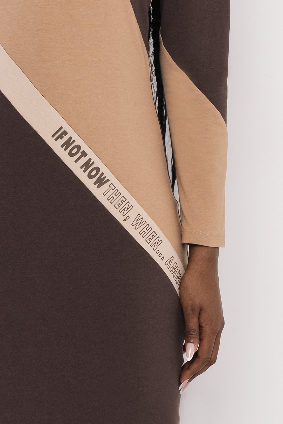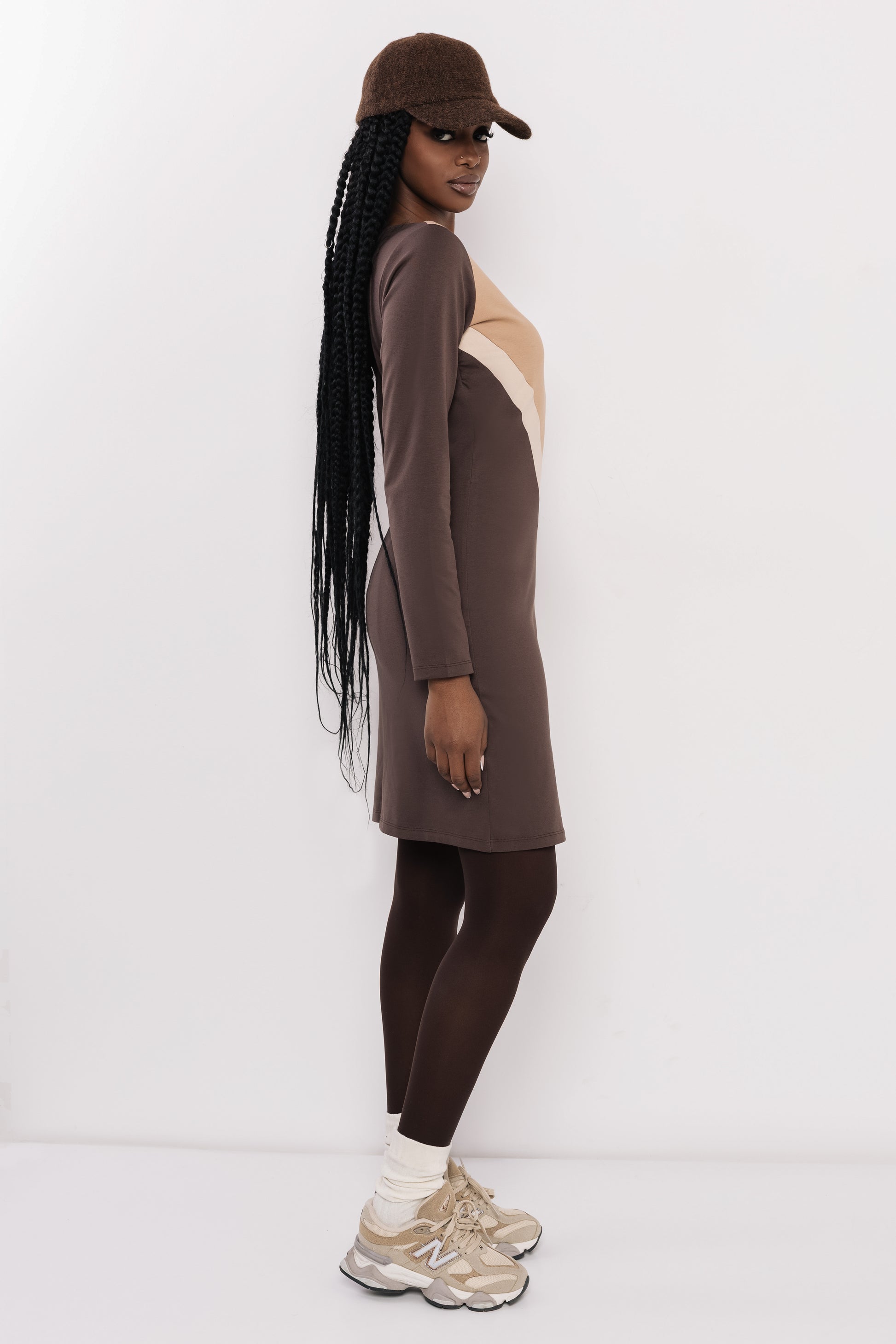 A Nox ruha játékos színkombinációval azonnal magára vonja a figyelmet. A csoki, camel és bézs tónusok átlós elrendezése karcsúsítja a sziluettet, miközben lendületet visz a megjelenésbe. A pamut anyag puha és rugalmas, így egész nap kényelmes viselet marad. A sportosan nőies fazon jól mutat sneakerrel és baseball sapkával, de akár bokacsizmával is kombinálható egy lezserebb szett részeként. A visszafogott logócsík az oldalán modern, AMNESIA-hatást ad a darabnak. Ha szereted a kényelmes, mégis látványos ruhákat, a Nox ruha biztosan bekerül az állandó kedvenceid közé – keresd az amnesia.hu webshopon, és próbáld ki, mennyire jól áll!