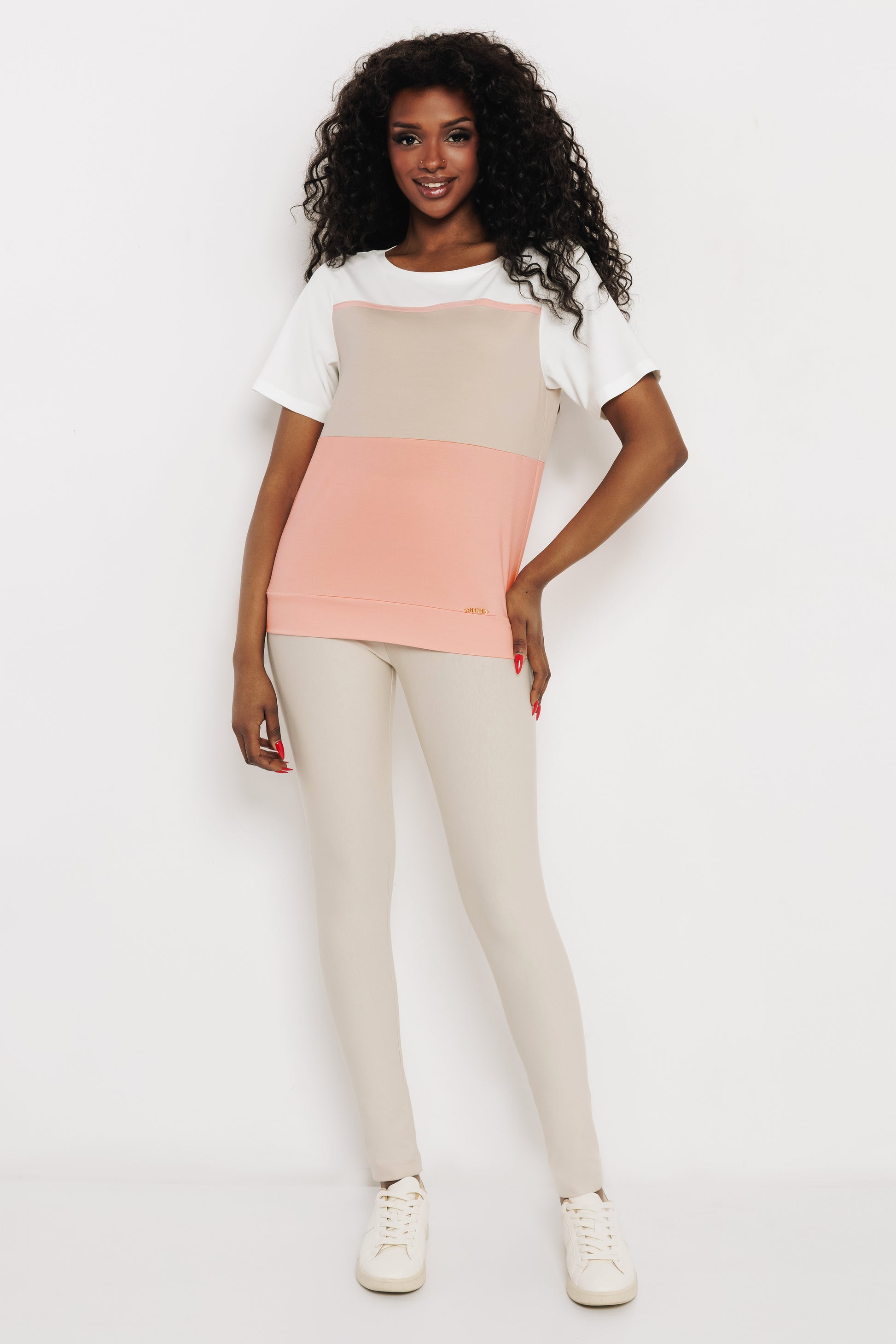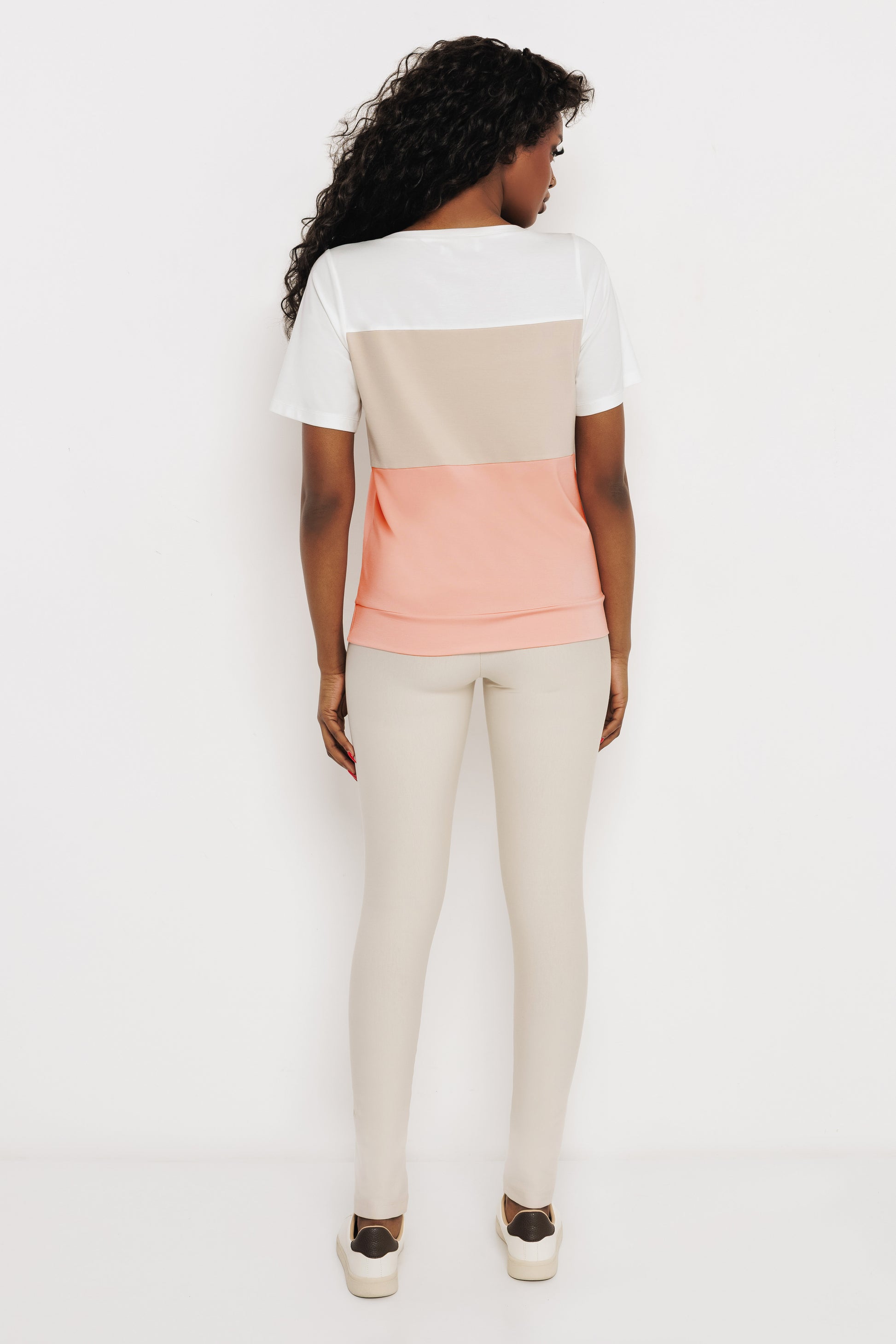 Az AMNESIA Zeti felső egy friss, színblokkolt darab, amely játékosan ötvözi az ekrü, barack és bézs árnyalatokat. A letisztult, enyhén bővebb fazon kényelmes viselet, a rövid ujj pedig könnyed, nyári hangulatot ad.