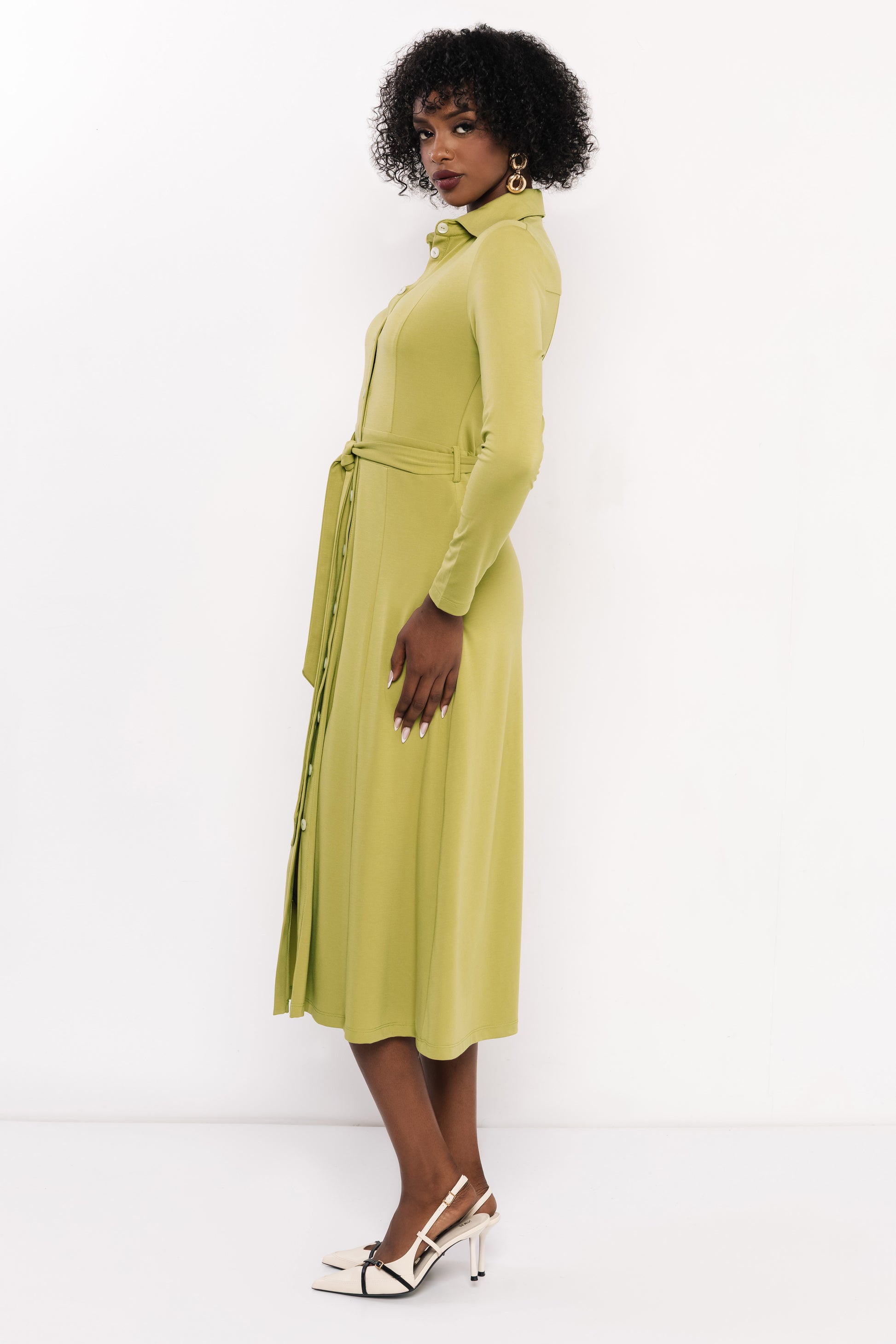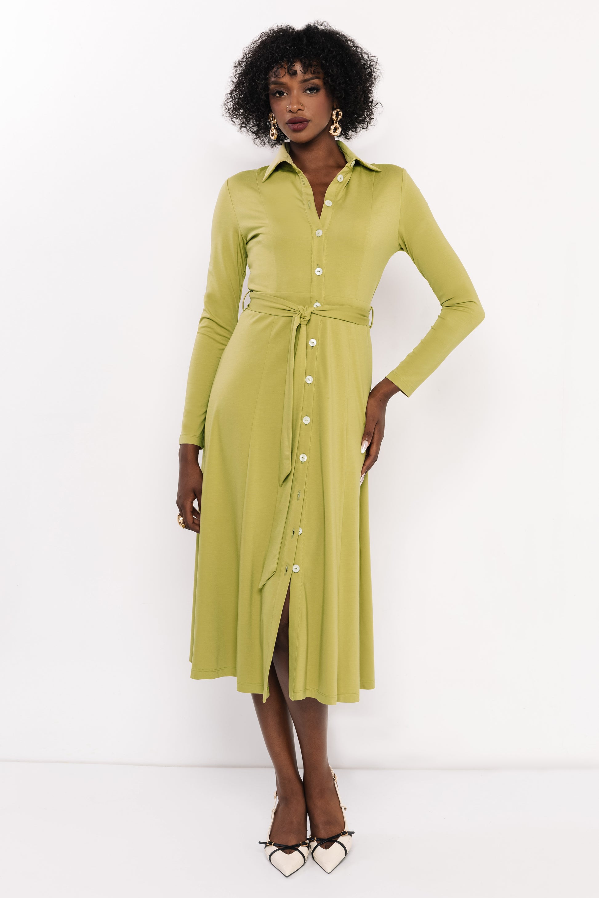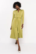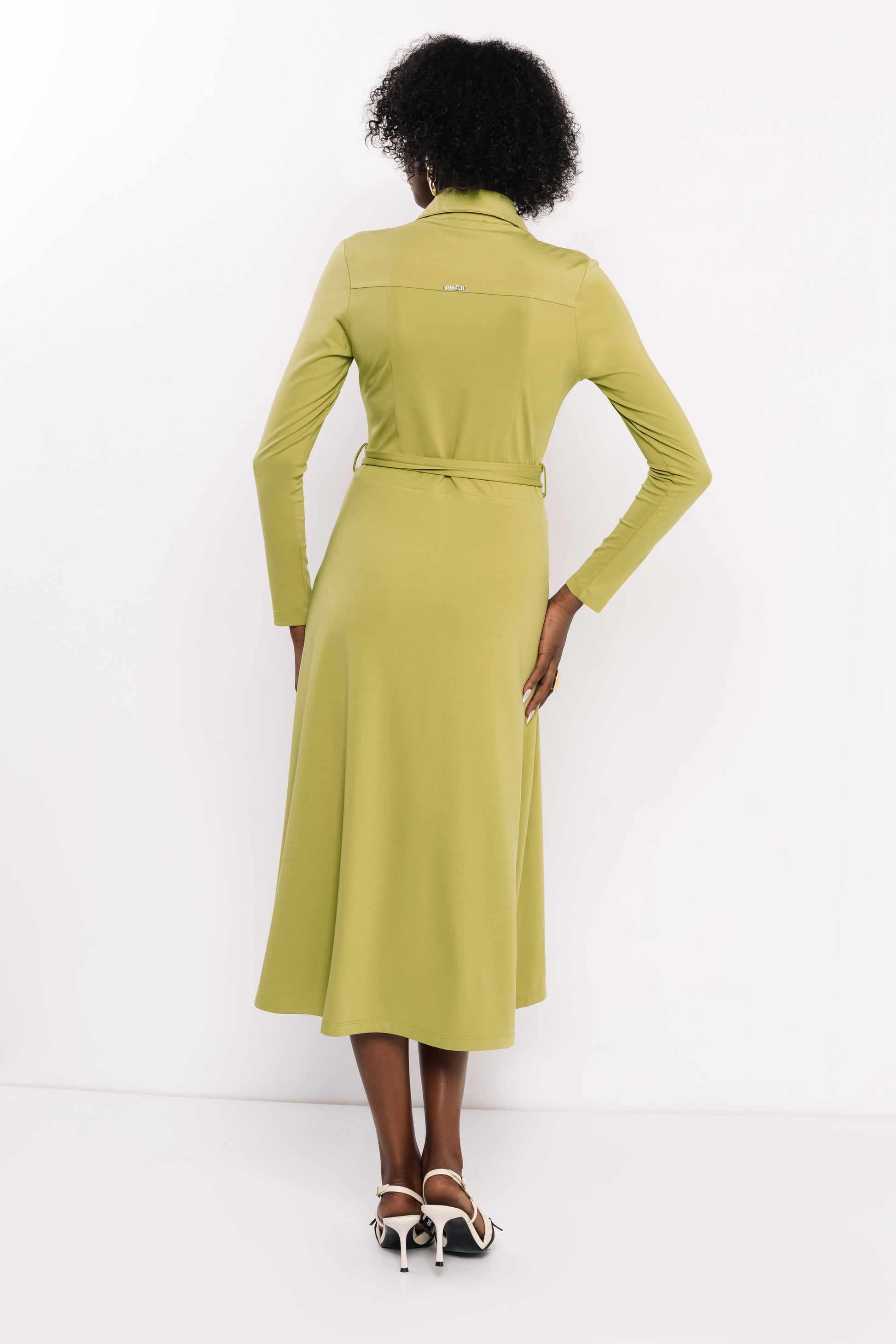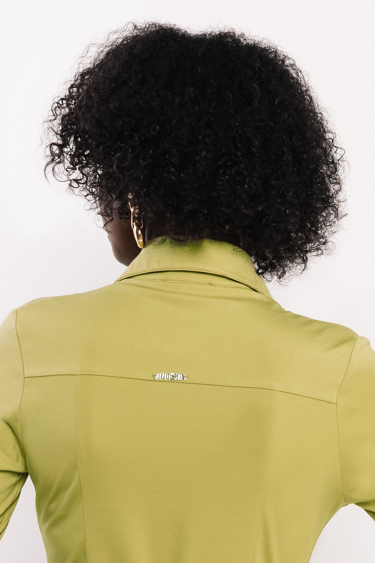 Az AMNESIA Zidi ruha a klasszikus ingruhát értelmezi újra nőies és modern formában. Vékony punto anyaga könnyű és rugalmas, amely kényelmes viseletet biztosít egész nap, miközben szépen követi a tested. Az egyméretes kialakítás univerzálisan illeszkedik, a gombos eleje és a levehető öv pedig variálható stílust ad: viselheted szorosabbra húzva a nőies sziluettért, vagy lazábban, lezser hangulatban. Az oliva zöld és fekete színekben elérhető darab tökéletes választás, ha eleganciát és praktikumot keresel egyben. Hosszabb, midi fazonja kifinomult és időtlen, a hátán elhelyezett fém AMNESIA logó pedig prémium részletként teszi különlegessé. Fedezd fel az amnesia.hu webshopban, és tedd a gardróbod alapdarabjává!