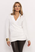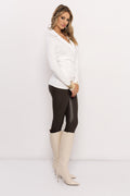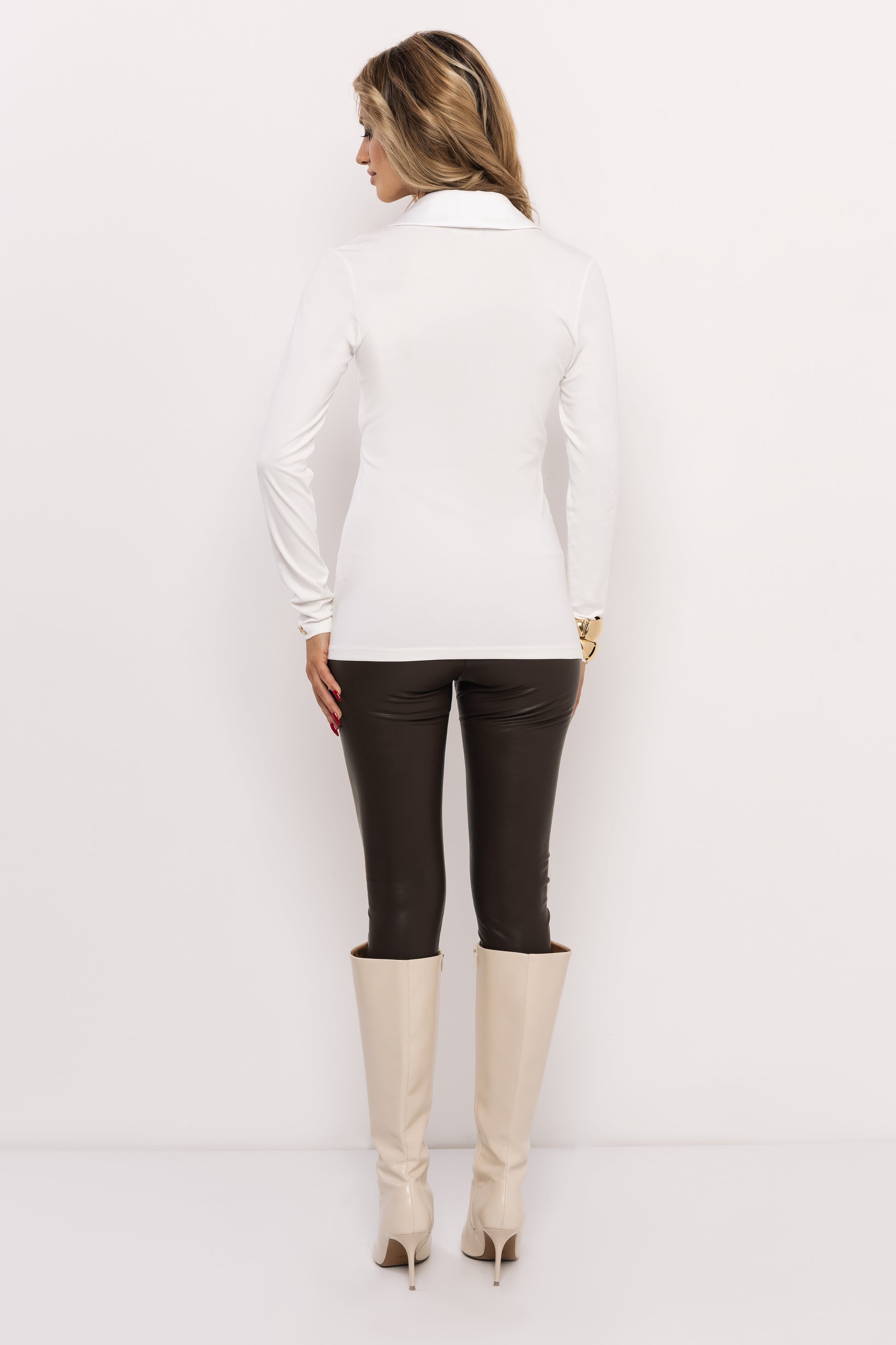 Az AMNESIA Zsofi felső nőies, mégis modern darab, amely minden alkalommal eleganciát sugároz. A vékony punto és szatén kombinációja kifinomult hatást kelt, a kihajtott, hosszított gallér pedig modern, trendi megjelenést ad. A fazon karcsúsított, így gyönyörűen követi az alakot, miközben a szatén gallér lágy fényt visz az összhatásba. Elérhető fekete és ekrü színben – az ekrü elegáns és friss, a fekete örök klasszikus. Kombináld bőrhatású nadrággal vagy az AMNESIA Zuky nadrággal, és egészítsd ki arany kiegészítőkkel az igazán nőies hatásért. Egy elegáns felső, ami tökéletes irodába, vacsorához vagy akár ünnepi alkalmakra – találd meg a saját színed az amnesia.hu webshopon!